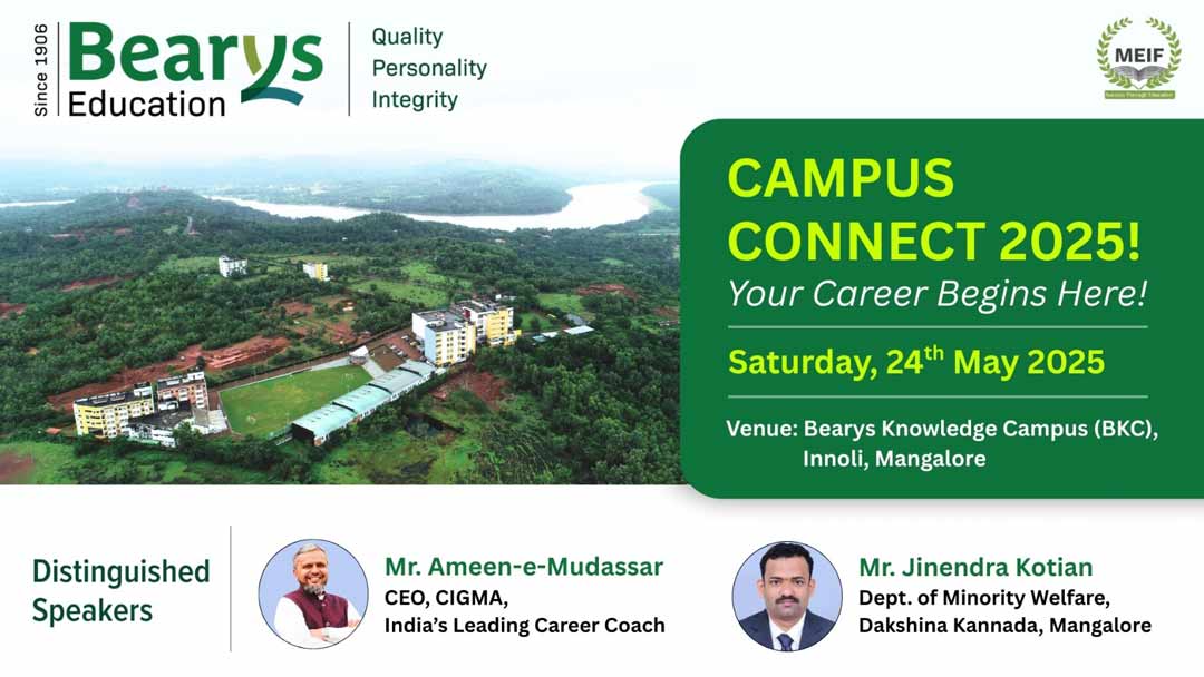 Mangaluru: Speaking at the ‘Bearys Campus Connect’ program organized for students and parents at the Bearys Knowledge Campus in Inoli, Mangaluru, on Saturday, CIGMA CEO and India’s leading career coach Ameen-e-Mudassar emphasized that along with education, personality, skills, and interests play a crucial role in the journey of life.