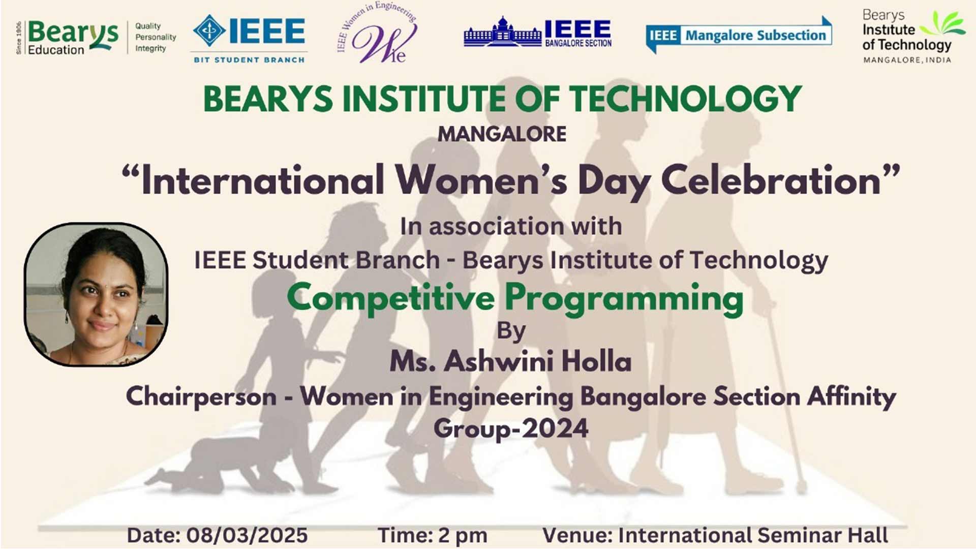 Mangalore, March 8, 2025 – Bearys Institute of Technology (BIT) celebrated International Women’s Day with an inspiring session on Competitive Programming in association with the IEEE Student Branch. The event, held at the International Seminar Hall, featured Ms. Ashwini Holla, Chairperson of the Women in Engineering Bangalore Section Affinity Group-2024, as the keynote speaker.