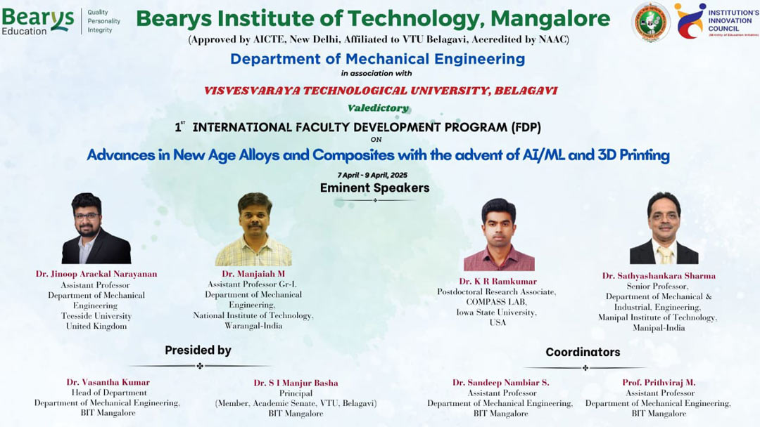 Mangaluru, April 10, 2025: The Department of Mechanical Engineering, Bearys Institute of Technology (BIT), Mangaluru, in association with Visvesvaraya Technological University (VTU), Belagavi, successfully organized a Three-day International Online Faculty Development Program (FDP) titled “New Age Alloys and Composites in the Advent of AI, ML, and 3D Printing” from April 7th to 9th, 2025. This virtual event saw the participation of over 230 attendees per session from academic institutions and industries across India and abroad.