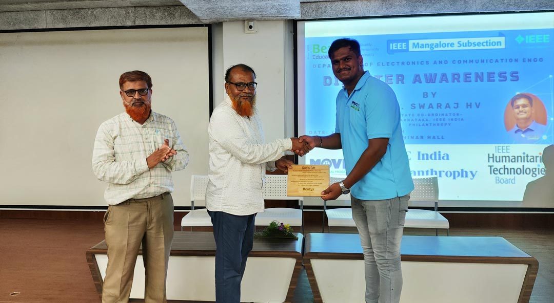 The Disaster Awareness event, organized by the Department of Electronics and Communication Engineering at Bearys Institute of Technology (BIT) with IEEE Mangalore Subsection, took place on November 7, 2024, at the International Seminar Hall. This impactful event focused on educating students, faculty, and school students on disaster preparedness and response.