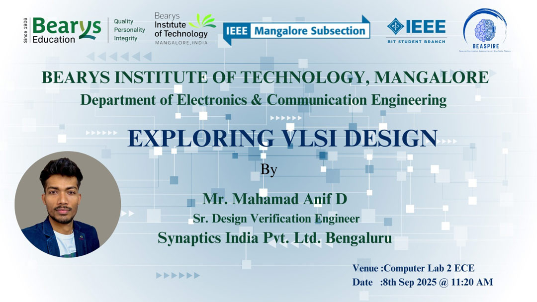Mangalore, Sept 8: The Department of Electronics and Communication Engineering, Bearys Institute of Technology (BIT), in association with IEEE Mangalore Subsection, IEEE BIT Student Branch, and BEASPIRE Student Association, organized a technical talk on “Exploring VLSI Design” on 8th September 2025 at Computer Lab 2, ECE.