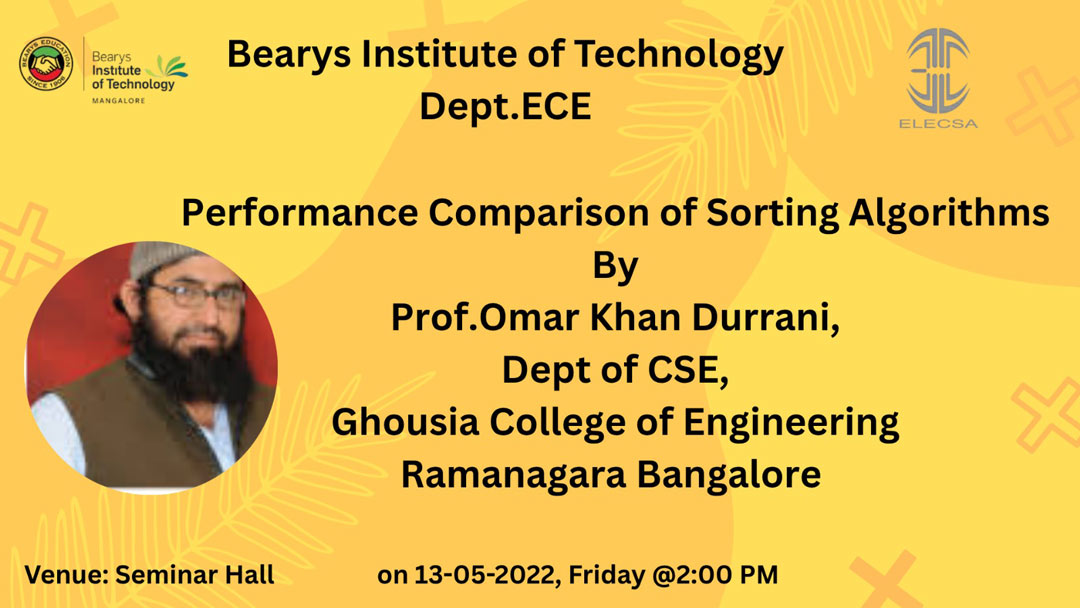 Department of Electronics and Communication Engineering (ECE), organized an expert talk on the topic “Performance Comparison of Sorting Algorithms” on 13th May 2022 at 2:00 PM in the Seminar Hall.