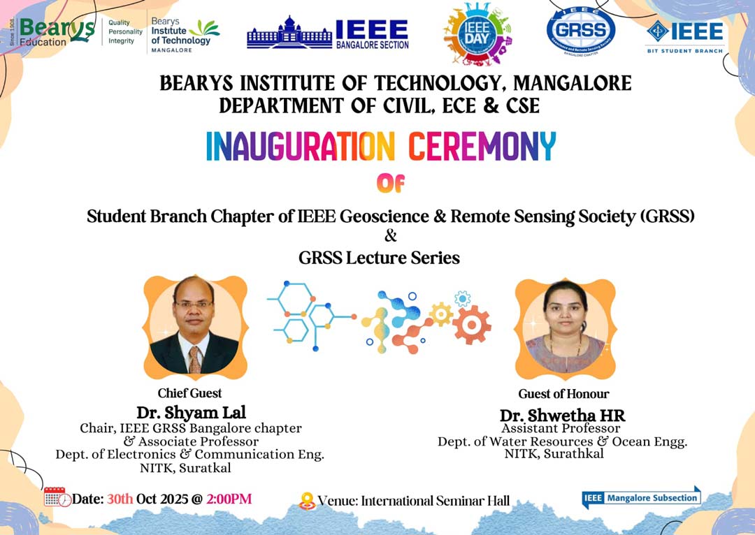 Bearys Institute of Technology (BIT), Mangalore, celebrated IEEE Day 2025 with the grand inauguration of the IEEE Geoscience and Remote Sensing Society (GRSS) Student Branch Chapter and the launch of the GRSS Lecture Series on 30th OCT 2025.