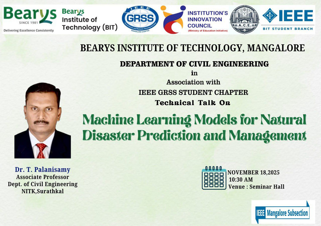 The Department of Civil Engineering at Bearys Institute of Technology, Mangalore organised a technical talk on the role of machine learning in natural disaster prediction and management. The event was held on 18 November 2025 in association with the IEEE GRSS Student Chapter, the Institution’s Innovation Council and the BIT IEEE Student Branch.