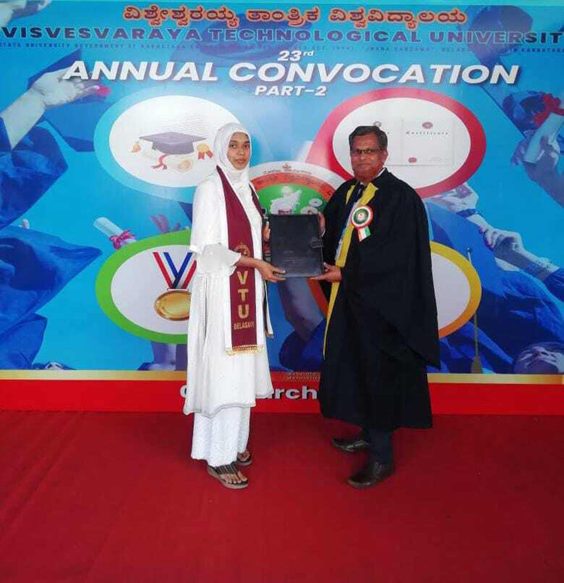 Arzoo Qadri, daughter of Abdul Azeez Qadri, achieved the 2nd rank in VTU M.Tech Computer Science & Engineering with a CGPA of 9.06. Arzoo, who hails from Bhatkal, completed her schooling and college education at Anjuman in Bhatkal.