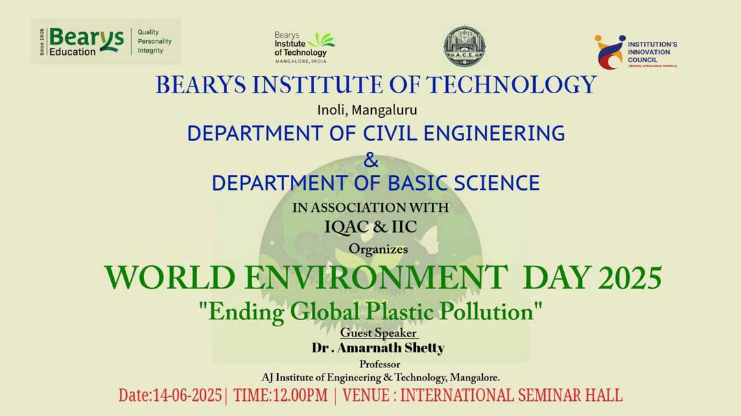 Bearys Institute of Technology, Mangaluru, proudly organized World Environment Day 2025 on 14th June at 12:00 PM in the International Seminar Hall. The event, themed “Ending Global Plastic Pollution”, was jointly hosted by the Department of Civil Engineering and the Department of Basic Science, in association with IQAC and IIC.